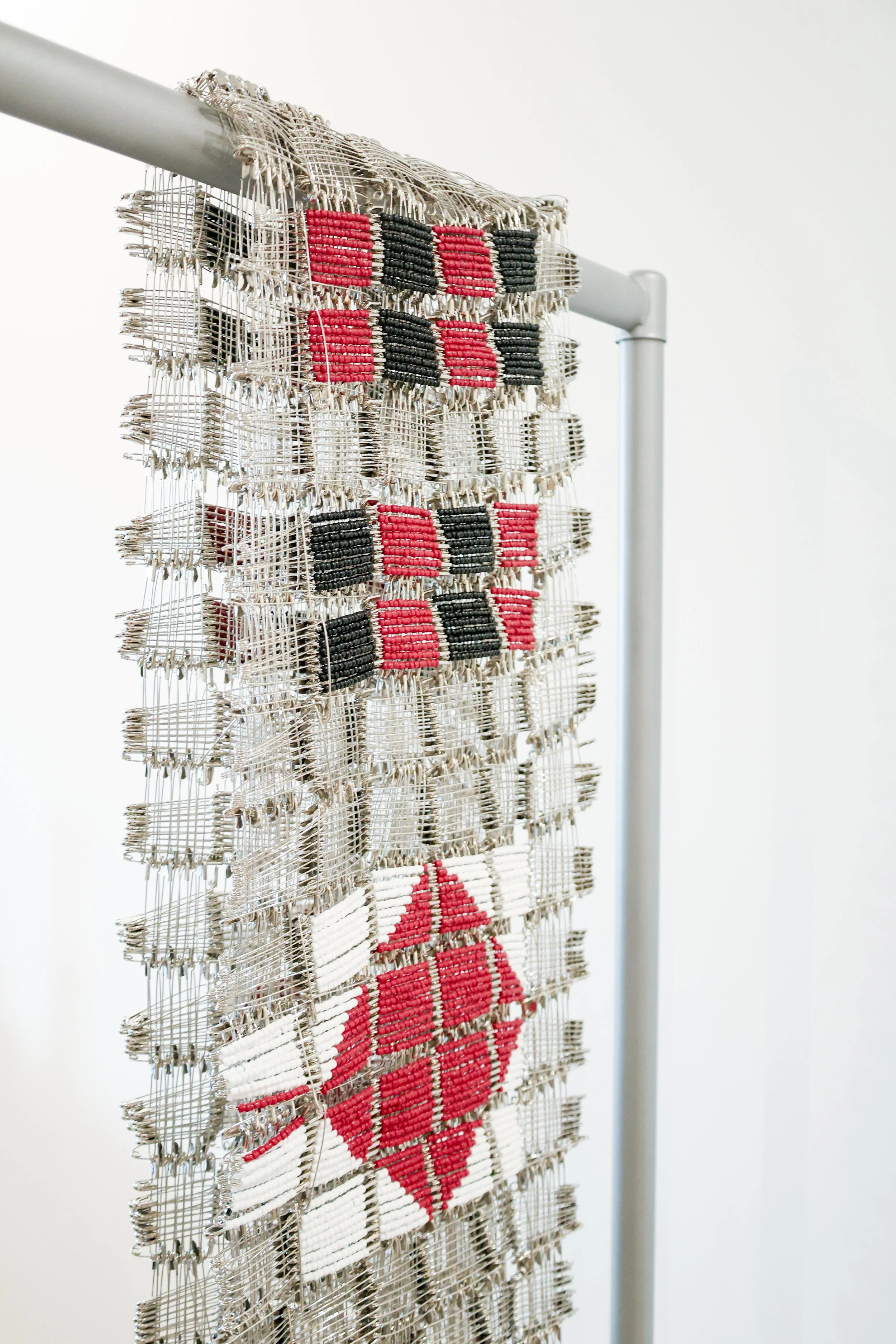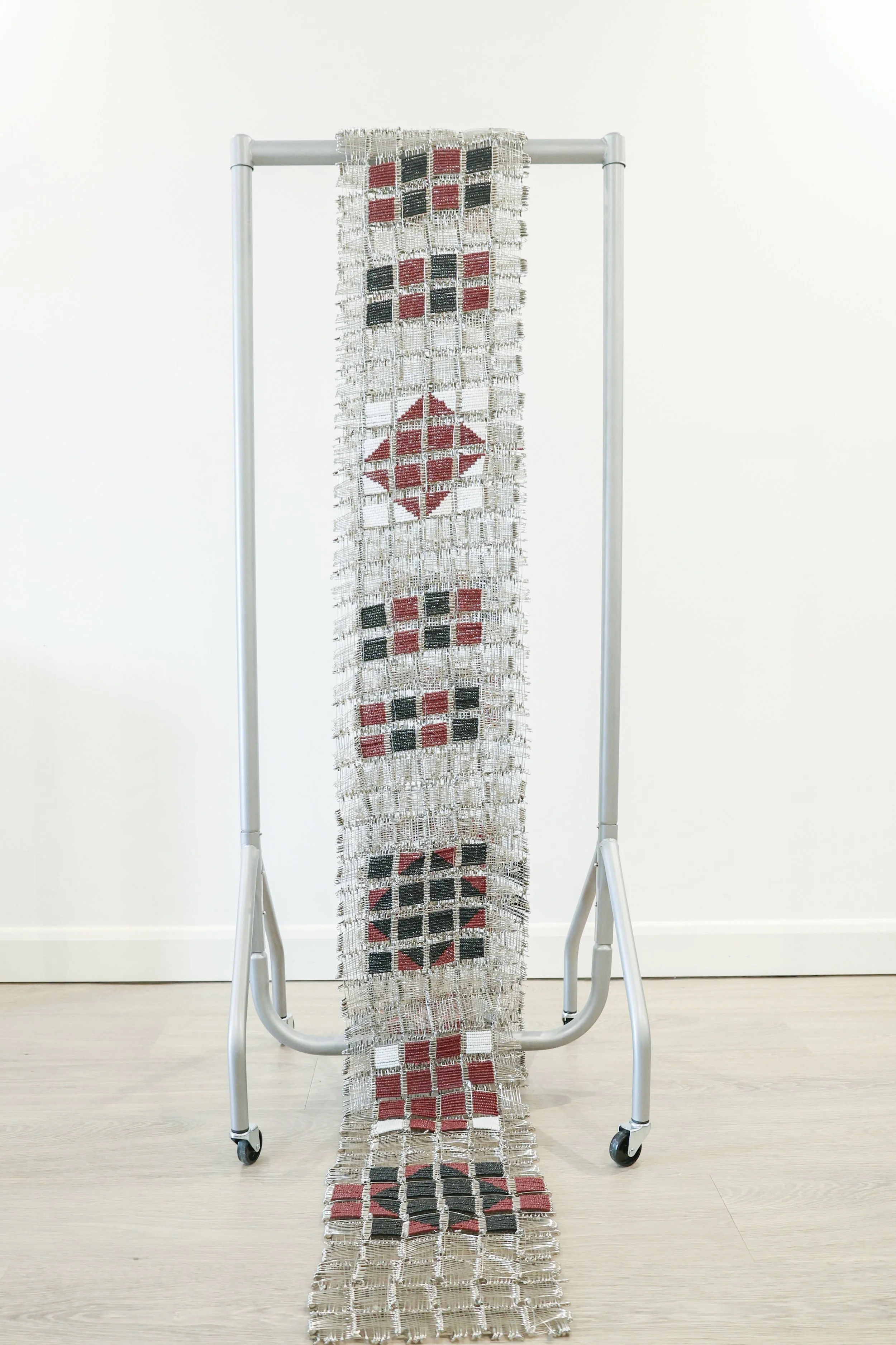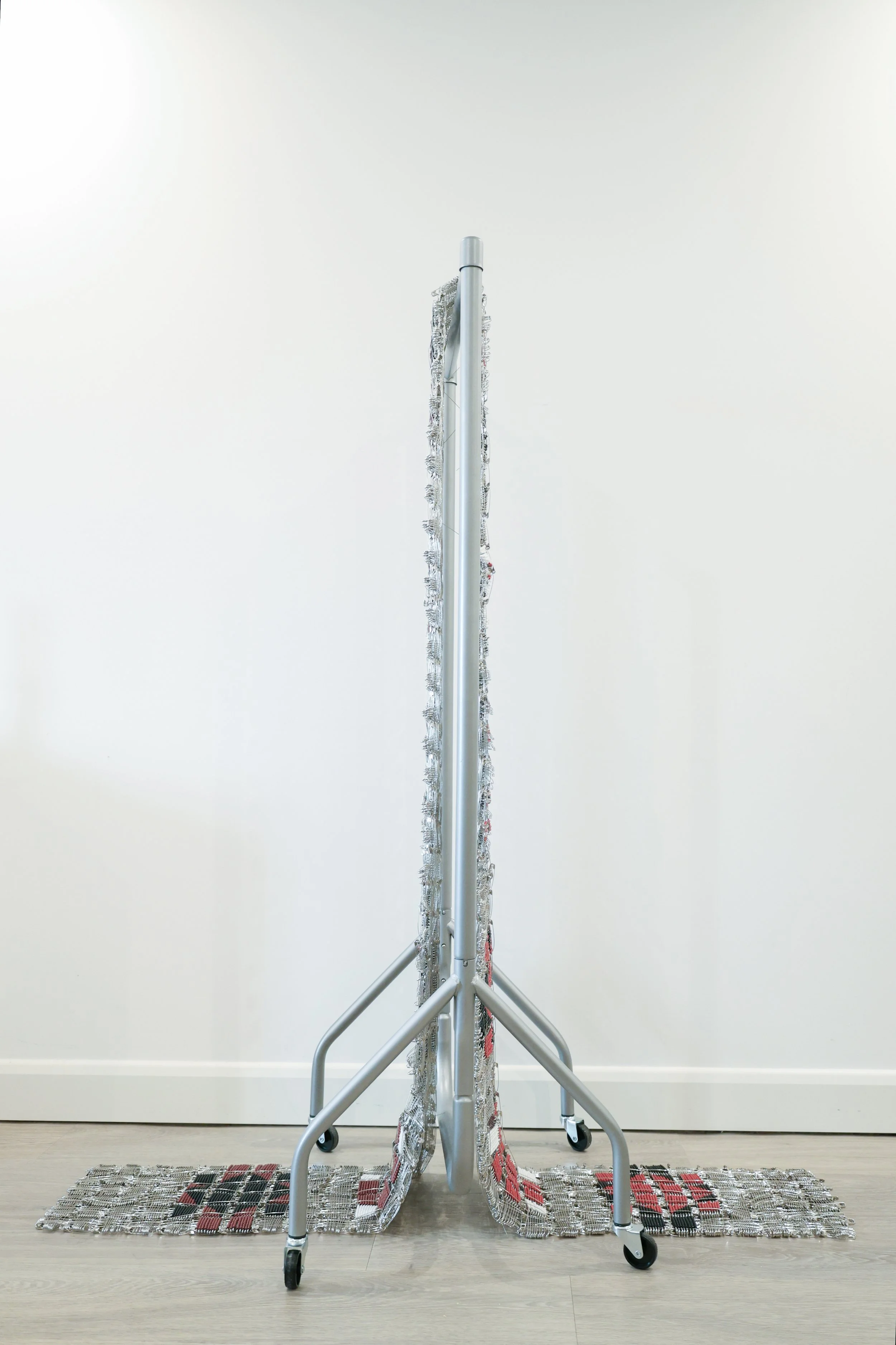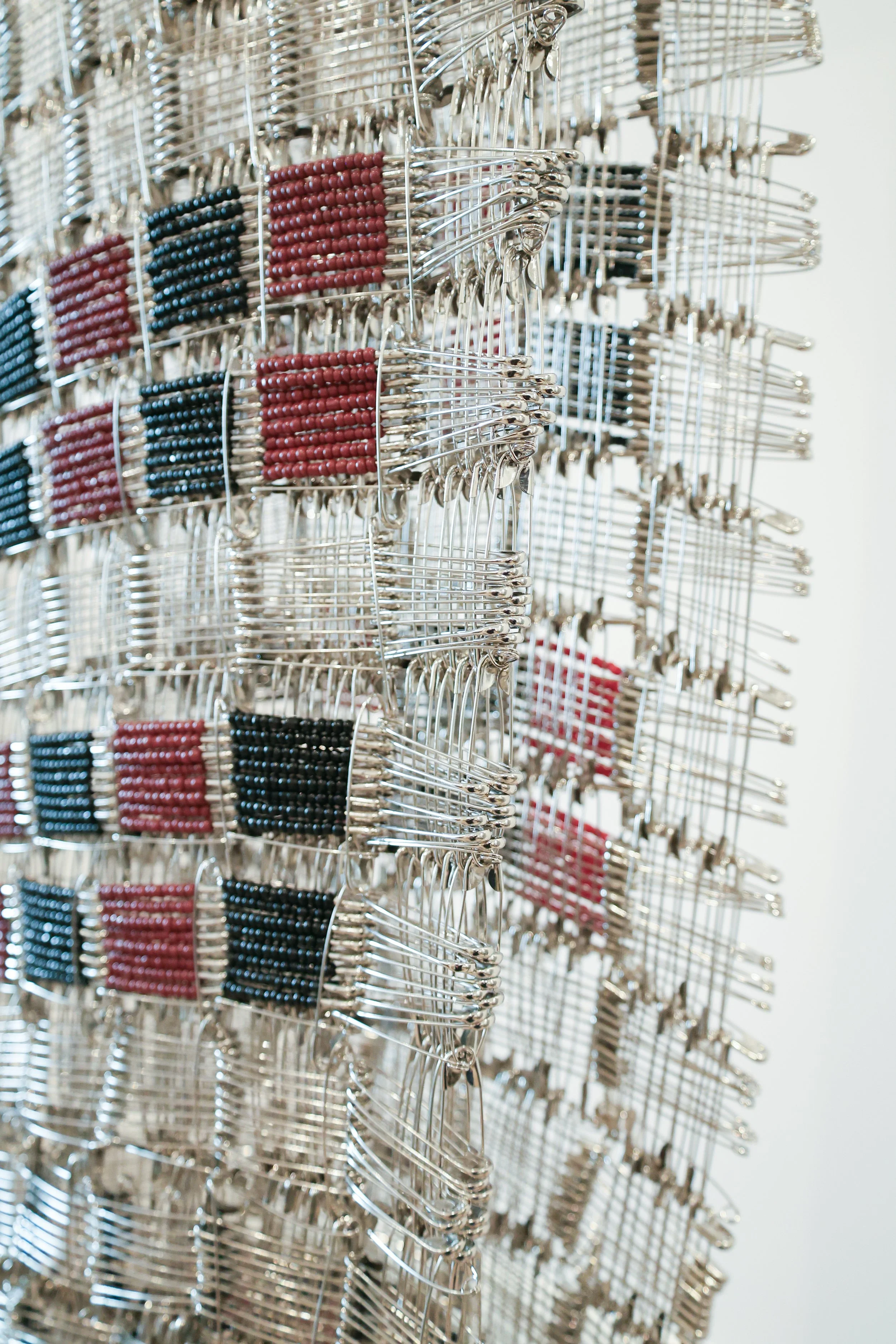 This work constructs a set of vertically extending structures with safety pins and beads, transforming repetitive manual labor into a visible social form. The tiny units form a fragile yet continuous whole in connection, metaphorically representing the mutual support and protection between minority groups and the working class in unstable situations. The material not only points to temporary repairs but also constitutes a visual order about care and unity, presenting the tension for the existence of the community between the fall and the maintenance.